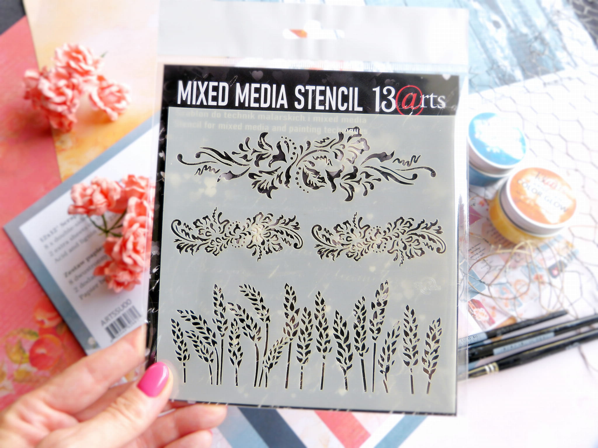 Maska / szablon do prac kreatywnych wykonany z półprzezroczystego tworzywa sztucznego o grubości 1mm. Z tym produktem przy pomocy farb, tuszów, mgiełek i past strukturalnych można uzyskać bardzo ciekawe efekty. Maska jest elastyczna i do wielokrotnego użytku. Po użyciu maskę należy umyć w wodzie z detergentem.