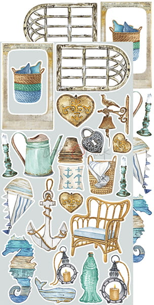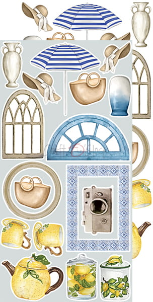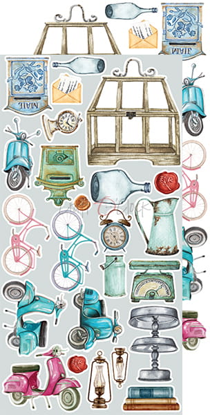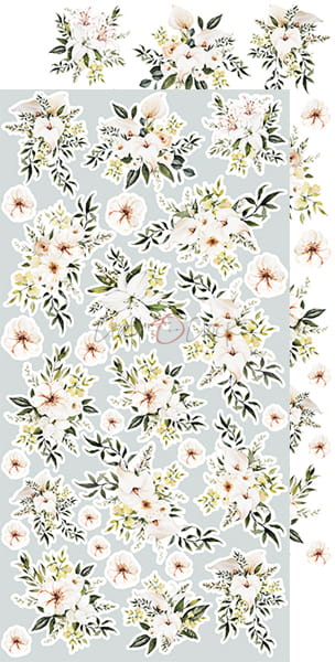 Zestaw 12 arkuszy wysokiej jakości dwustronnego papieru do scrapbookingu z dodatkami do samodzielnego wycięcia. 2x6 wzorów + dodatkowe elementy (ramki) do wycięcia na odwrocie strony tytułowej.