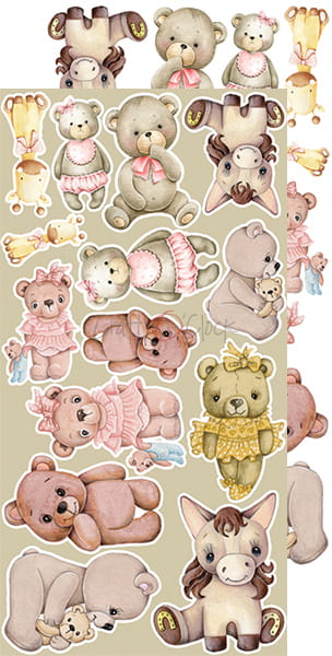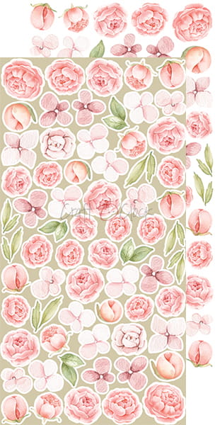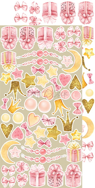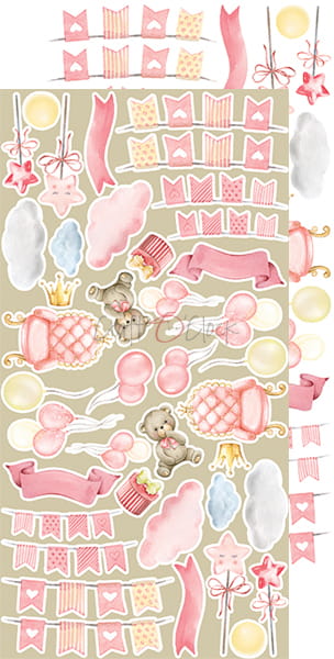Zestaw 18 arkuszy wysokiej jakości dwustronnego papieru do scrapbookingu z dodatkami do samodzielnego wycięcia. 3x6 wzorów + dodatkowe elementy (ramki) do wycięcia na odwrocie strony tytułowej.