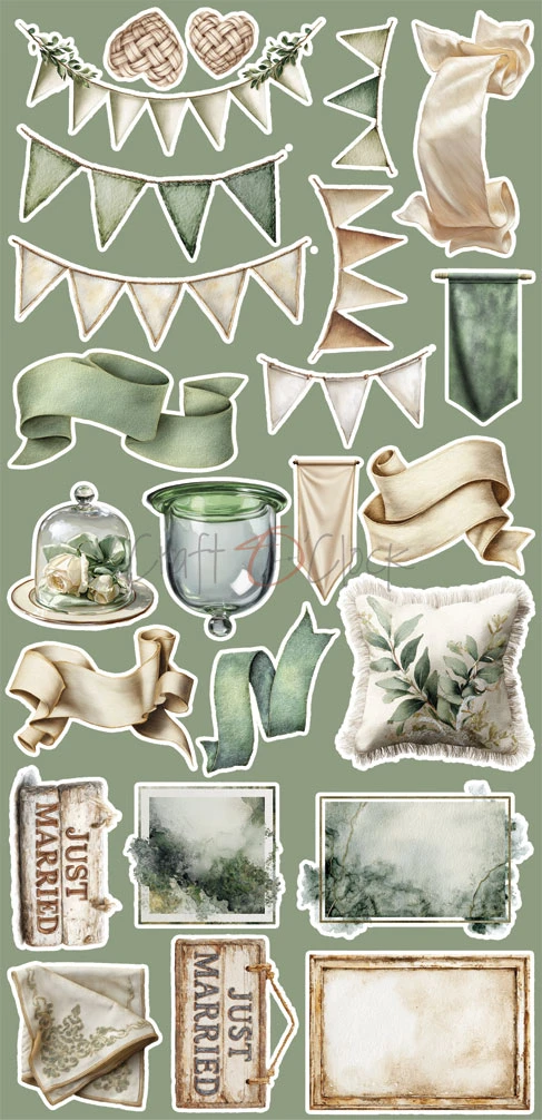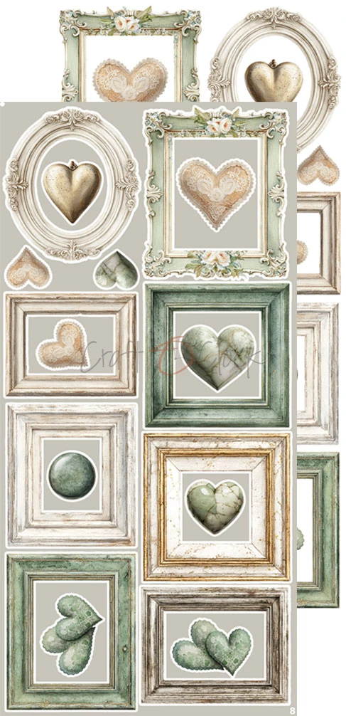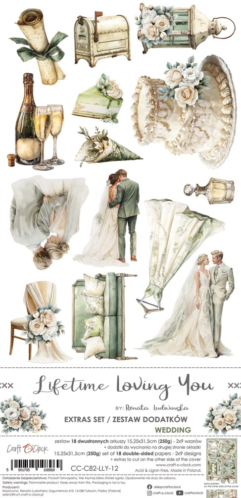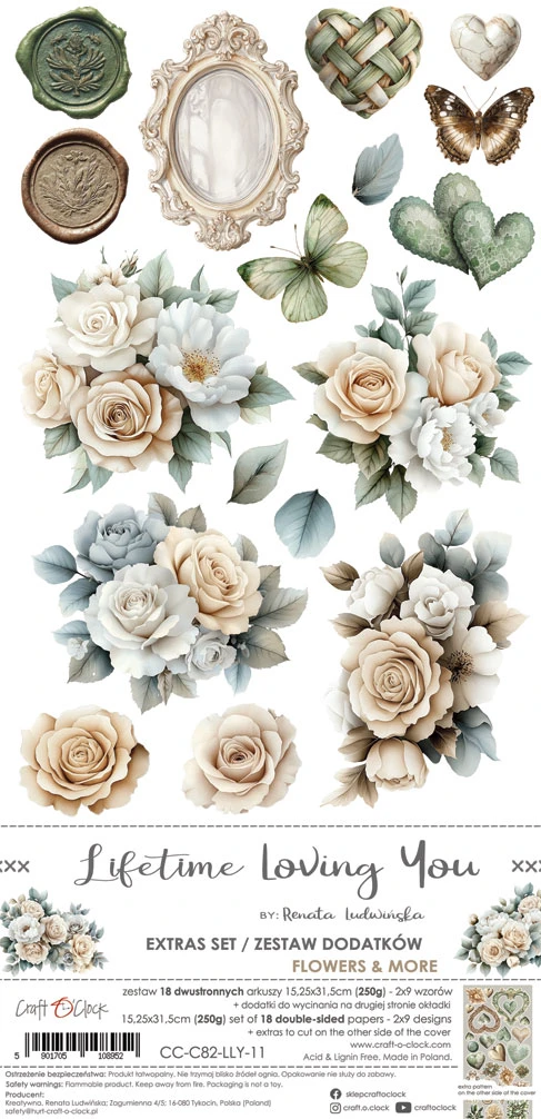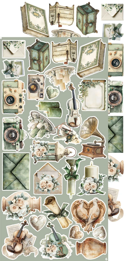 Zestaw 18 arkuszy wysokiej jakości dwustronnego papieru do scrapbookingu z dodatkami do samodzielnego wycięcia.